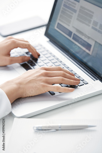 Typing on laptop keyboard. Close-up of a young woman holding brush in her hand and applying makeup. Isolated on light blue background.