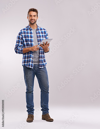 Typing, tablet and man with connection, portrait and communication on a grey studio background. Person, mockup space and model with technology or digital app with social media, smile and website info