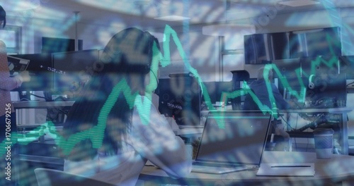 Typing woman wearing white blouse working on laptop at open-plan office, with stock chart overlays