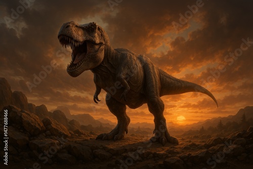 Tyrannosaurus rex stands on rocky terrain during sunset. The dinosaur with sharp teeth. Apex predator in prehistoric era