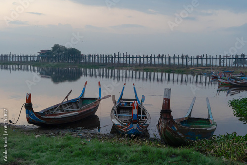 U Bein Bridge with lake, Wooden Bridge in Mon village, Myanmar or Burma, Asia.