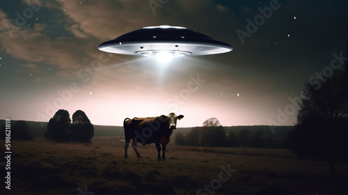 UFO flying saucer hovering above the cow at night. Alien spaceship arrive. World UFO Day Ai generated illustration
