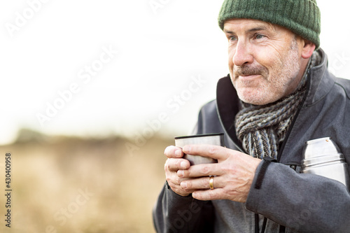 UK, London, Epping Forest, Man drinking coffee in landscape