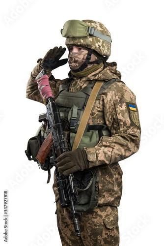 Ukraine officer in mechanized infantry uniform isolated with clipping path on white background. (Flag and arms of Ukraine on the shoulder. Patch on the chest with the inscription Ukraine in Ukrainian)
