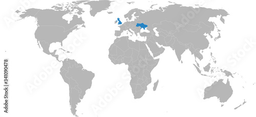 Ukraine, United kingdom, countries highlighted on world map. Business concepts, diplomatic, trade, transport relations.