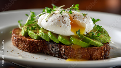 Ultra HD Poached egg and avocado on the toast image poached egg on avocado toast picture healthy dinner photo sliced avocado and poached egg on the fried bread picture