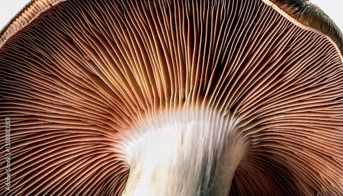 Ultra macro Portobello mushroom gills: intricate radial pattern. Delicate fungal texture, organic detail. Unique nature close-up.