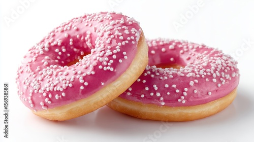 Ultra quality image of zwei leckere pink farbene Donuts mit weissen Streuseln freigestellt auf weißem Hintergrund.