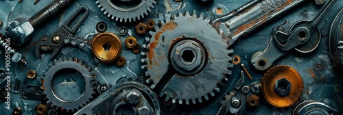 Ultra sharp photo illustrating a metal-themed background incorporating mechanical tools, pipes