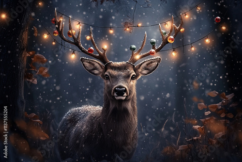 Ultra wide angle view from a big white Beautiful deer with large, beautiful antlers stands and in the snowy winter forest.