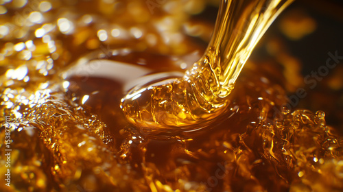 Ultra-High Resolution Extreme Macro Shot of Thick Golden Honey Slowly Dripping from a Shiny Silver Spoon