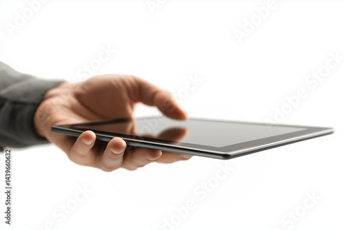 ultra-realistic close-up of a person's hands holding a digital tablet in landscape mode, no face visible, tablet screen glowing, isolated on white background