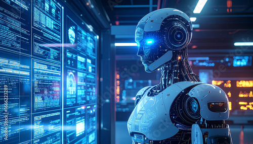Ultra-realistic humanoid robot with glowing blue eyes standing in futuristic laboratory interior