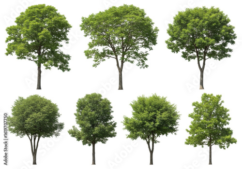 Ultra-realistic UHD photo of various distinct green trees with lush vibrant foliage, diverse textures, and sturdy trunks, presented as full standalone objects from a 3/4 view against a pristine pure