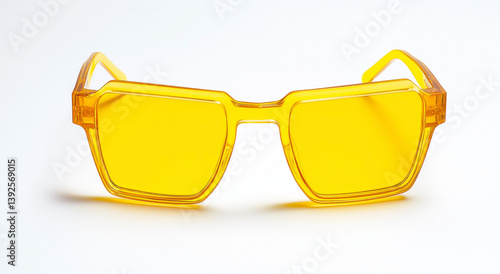 um par de óculos de sol amarelos em um fundo branco As lentes dos óculos de sol são de uma cor amarela brilhante e a armação tem um design elegante e moderno