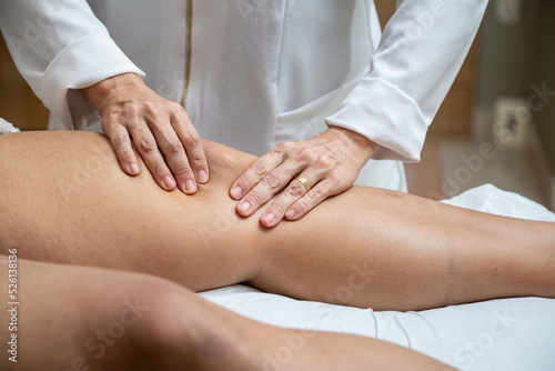 Um profissional fazendo massagem terapêutica no joelho do paciente que está deitado na maca.