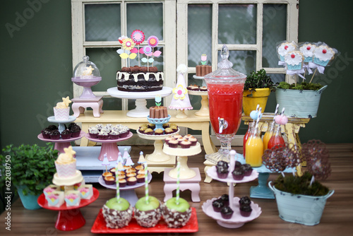 Uma mesa colorida e vibrante em um evento infantil, repleta de alimentos saudáveis, frescos e deliciosos. Uma festa que promove a alimentação equilibrada e a diversão saudável para as crianças.
