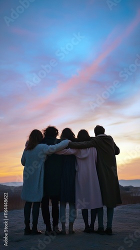 Un groupe de femmes, vue de dos, s'enlaçant sous un ciel de coucher de soleil, scène symbolisant une atmosphère d'amour et d'amitié.