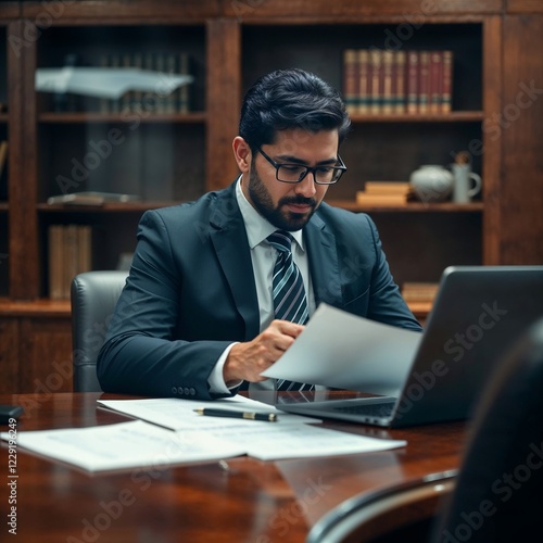 Un hombre profesional hispano revisando documentos en una oficina elegante con estanterías de madera al fondo. Viste traje formal y trabaja en un escritorio, con una laptop abierta y papeles organizad