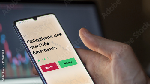Un investisseur analyse un fonds etf obligations des marchés émergents sur un graphique. Un téléphone affiche le cours de l'ETF. Texte en français francais Obligations des marchés émergents