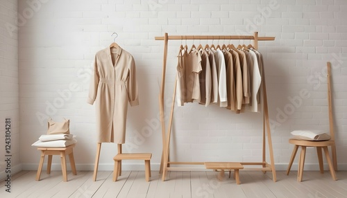 Un perchero de madera con varias prendas de vestir de colores beige y neutros colgadas, incluidas camisas, vestidos y pantalones. El estante está colocado contra una pared de ladrillo blanco
