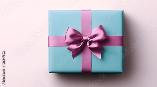 Una caja de regalos azul con una cinta rosa en ella y fondo rosa