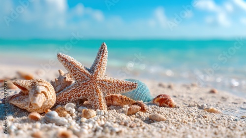 Una estrella de mar y conchas en una playa de arena con un cielo azul claro y el océano al fondo.