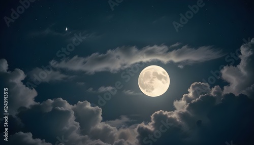 Una gran luna llena que se eleva sobre un cielo nocturno nublado con estrellas en el fondo