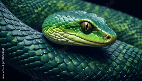 Una imagen de primer plano de la piel escamosa de una serpiente verde, que muestra el patrón intrincado y texturizado de sus escamas sobre un fondo oscuro