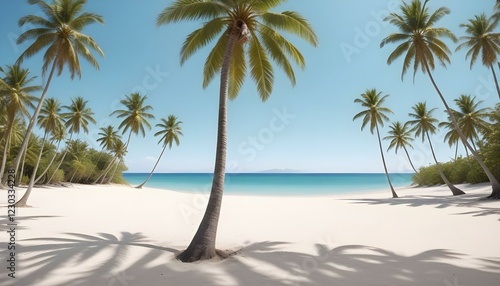 Una playa tropical con palmeras, un cielo azul claro y una orilla arenosa