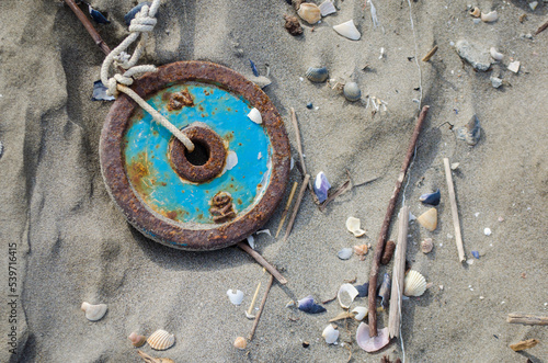 Una ruota metallica blu arrugginita e legata da una corda sulla sabbia della spiaggia di Pellestrina, isola della laguna di Venezia