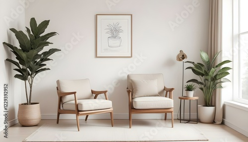 Una sala de estar minimalista con un sillón beige, una pequeña mesa auxiliar de madera y una maceta contra una pared blanca y lisa