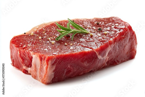 Una succulenta bistecca di manzo cruda, condita con spezie e guarnita con un rametto di rosmarino, su sfondo bianco trasparente