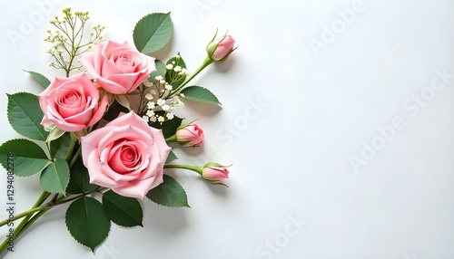 Una toma panorámica y desde un ángulo alto presenta un arreglo floral sobre un fondo blanco con textura. El arreglo presenta una variedad de rosas rosadas, algunas completamente florecidas