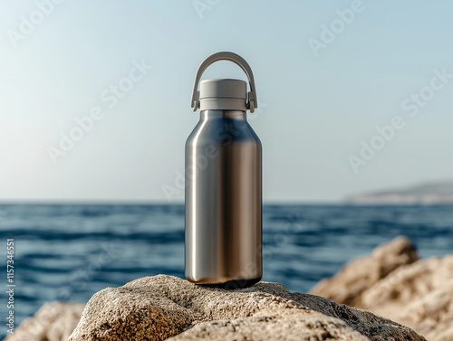 Unauffällige Wasserflasche auf einem Felsen mit Meerblick