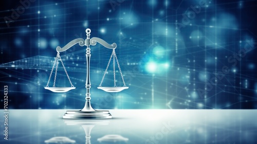 Unbiased artificial intelligence, Scales of Justice in Digital World Concept. Digital illustration Scales on futuristic blue data network background. Fairness and equality in ethical AI systems