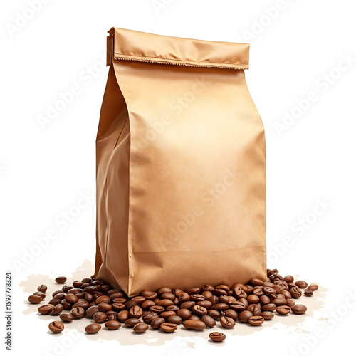 Unbranded kraft paper bag filled with roasted coffee beans on a white background