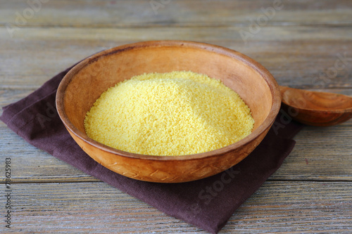 Uncooked couscous in a clay bowl on wooden boards