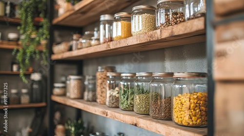 Uncooked groceries in glass jars arranged on wooden shelves of kitchen