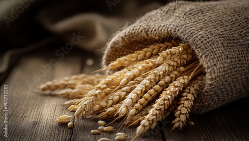 Uncooked wheat grain in burlap sack on rustic wooden table