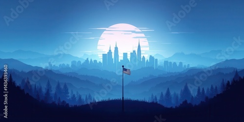 under 200 characters): A silhouetted city skyline rises beyond forested hills at sunrise, with an American flag in the foreground and a large, glowing sun in the background.