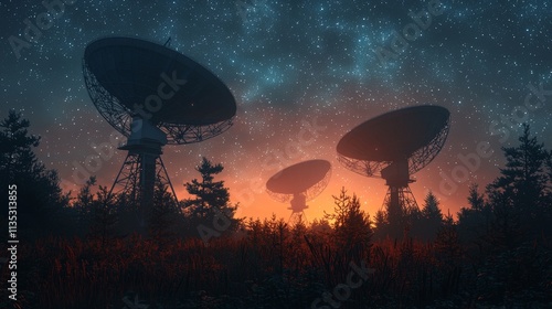 Under a starry night sky, a massive satellite dish is positioned in a field.