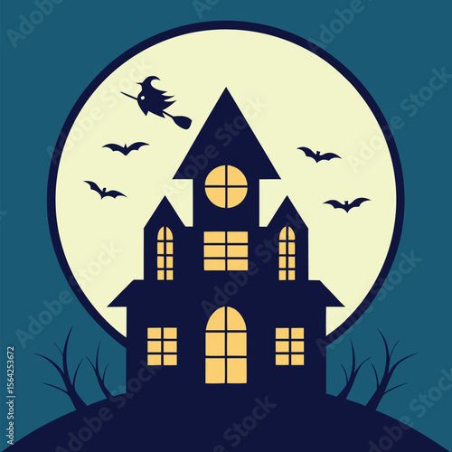 Under the moonlight, a witch flies her broomstick near the spooky haunted house