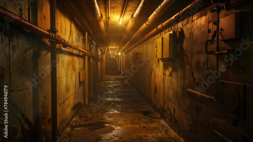 Underground Bunker Hallway with Exposed Pipes and Dim Lighting