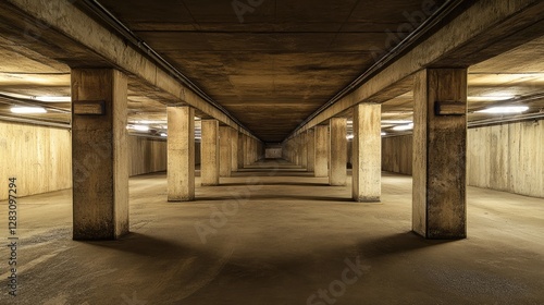 Underground parking garage with reinforced concrete pillars and ventilation system