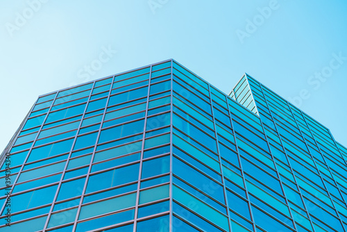 underside panoramic and perspective view to steel blue glass high rise building skyscrapers, business concept of successful industrial architecture