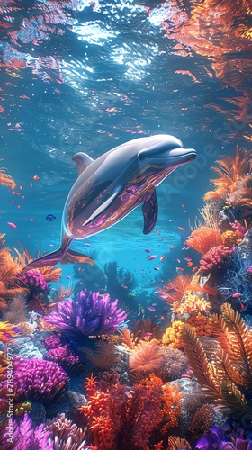 Underwater 3D rendering of a fancy bottlenose dolphin, emitting colorful echolocation pulses amidst coral reefs
