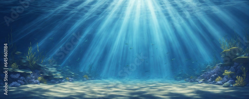 underwater background deep blue sea and beautiful light rays with sandy floor