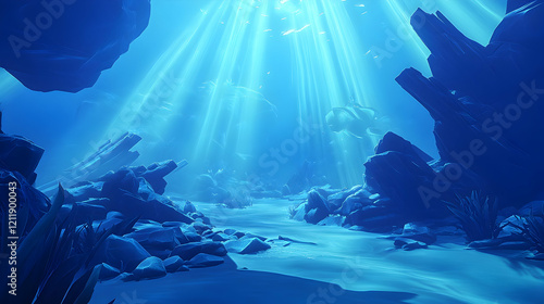 Underwater canyon sunlight beams illuminate sandy seabed, marine life visible, background deep ocean, ideal for game backgrounds