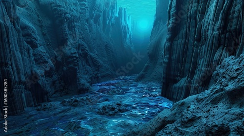 Underwater Canyon with Vibrant Blue Layers and Liquid Avalanche Effect, Sonar Ripple Texture.
